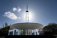 Foto van een van Nijmegen's meest bijzondere gebouwen, de vliegende schotel. Een voormalig Texaco-station aan de Muldersweg. De laatste jaren was hier een architektenbureau in gevestigd. Nog steeds is dit gebouw een eyecatcher.