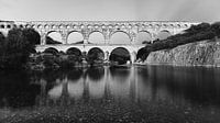 Een 16:9 foto in Zwart-Wit van een vroege zomerochtend voor zonsopkomst bij Pont Du Gard, een Romeins aquaduct over de Gardon rivier. Het bouwwerk ligt bij het stadje Vers-Pont-du-Gard, een gemeente in het Franse departement Gard.