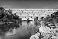 Romeins aquaduct / brug in Frankrijk / Zuid-Frankrijk aan de rivier de Gard / Gardon in zwart-wit .