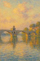 Dit impressionistische kunstwerk toont de historische Pont d'Avignon die oplicht onder een warme, gouden zonsondergang. Geschilderd in een lichtgevend palet van zacht geel, pastelroze en zachte lavendeltinten, benadrukt de scène de elegante bogen van de brug die zich uitstrekt over de rivier de Rhône. Het omringende water weerspiegelt…