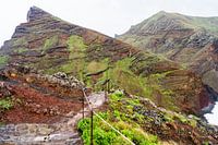 Foto van een pad langs de rotsachtige kust met puntige bergen bij Ponta de Sao Lourenco in Madeira, Portugal.