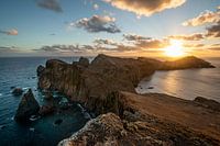 Zonsopkomst over het uitzichtpunt van Ponta do Rosto in Madeira, een eiland van Portugal. Dramatische rotspartij die de zee in kronkelt. Landschapsfotografie.