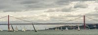 Opname van de kenmerkende tuibrug in Lissabon. Onder de brug een armada van zeilboten op een windige dag.