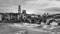 Een zwart-wit foto bij de oude historische brug Ponte Pietra in Verona aan de rivier de Adige in de provincie Veneto, Italië.