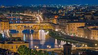 Een 16:9 foto genomen Piazzale Michelangelo op een avond na zonsondergang met de beroemde Ponte Vecchio-brug. De oude brug die buigt over de Arno-rivier in Florence, Italië.