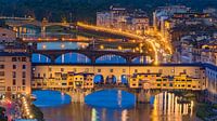 Een 16:9 foto genomen Piazzale Michelangelo op een avond na zonsondergang met de beroemde Ponte Vecchio-brug. De oude brug die buigt over de Arno-rivier in Florence, Italië.