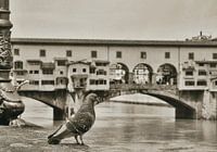 De Ponte Vecchio in Florence met op de voorgrond een stadsduif. Deze middeleeuwse brug over rivier de Arno is een van de oudste bruggen van Europa.