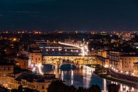 De omliggende stad is eveneens sfeervol verlicht, met gebouwen en straten die bijdragen aan het levendige maar serene nachtelijke uitzicht. Deze scène vangt niet alleen de grootsheid van de Ponte Vecchio, maar ook de tijdloze schoonheid en rijke cultuur van Florence. Het is een prachtig voorbeeld van hoe geschiedenis en moderniteit samenkomen.