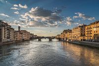 De beroemde middeleeuwse brug Ponte Vecchio over de rivier de Arno in Florence, Italie. Een mooie dramatische lucht.