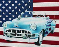 Koop dit Popart kunstwerk Pontiac Chieftain Convertible 1950 met vlag van de V.S. van Jan Keteleer op canvas, aluminium dibond, (ingelijste) fotoprint, behang en ArtFrame, op maat geprint in Fine-Art kwaliteit.