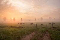 Foto van een mistige ochtend in de uiterwaarden bij de brug van Heusden met een mooie zonsopkomst.
