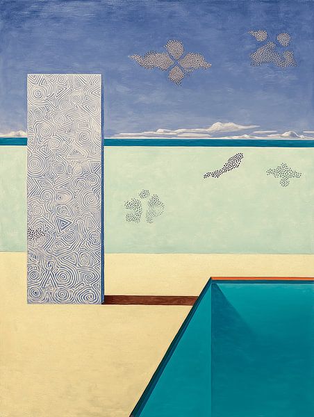 TERA toont een verstild, abstract zwembadlandschap waarin water, ruimte en architectuur samenkomen. Door het gebruik van vereenvoudigde vormen en een heldere compositie balanceert het werk tussen herkenning en abstractie. Het artwork is digitaal opgebouwd en geïnspireerd op traditionele materialen en grafische technieken, waarbij…