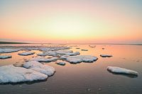 Arctisch ijs en zee panoramisch landschap op de zandplaten in de Waddenzee op het eiland Schiermonnikoog tijdens een koude winterse zonsopgang.