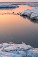 Arctisch ijs en zee panoramisch landschap op de zandplaten in de Waddenzee op het eiland Schiermonnikoog tijdens een koude winterse zonsopgang.