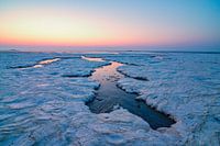 Arctisch ijs en zee panoramisch landschap op de zandplaten in de Waddenzee op het eiland Schiermonnikoog tijdens een koude winterse zonsopgang.