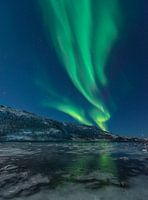 Noorderlicht, poollicht of Aurora Borealis in de nachtelijke hemel boven het eiland Senja in Noord-Noorwegen. Besneeuwde bergen op de achtergrond met water van de Noorse Zee dat het licht op de voorgrond weerkaatst. Maanlicht verlicht het besneeuwde landschap.