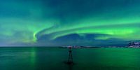 Noorderlicht of Poollicht of Aurora Borealis in de nachthemel boven het eiland Senja in Noord-Noorwegen. In de achtergrond liggen met sneeuw bedekte bergen en het Noorderlicht wordt gereflecteerd in het fjord in de voorgrond. Poollicht wordt veroorzaakt door zonnewinden is vooral sterk bij uitbarstingen (van plasmawolken) op de zon.