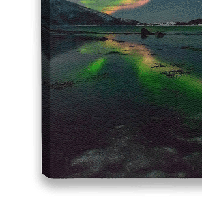 Noorderlicht of Poollicht of Aurora Borealis in de nachthemel boven het eiland Senja in Noord-Noorwegen. In de achtergrond liggen met sneeuw bedekte bergen en het Noorderlicht wordt gereflecteerd in het fjord in de voorgrond. Poollicht wordt veroorzaakt door zonnewinden is vooral sterk bij uitbarstingen (van plasmawolken) op de zon.