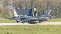 Een F-16 van de Poolse Luchtmacht taxiet de startbaan op van vliegbasis Leeuwarden .