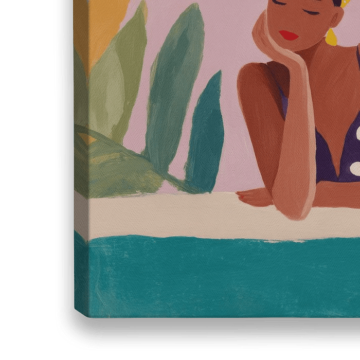 Even niks. Alleen de zon, wat palmen en het geluid van water op de achtergrond. Dromerig moment aan het zwembad met retro flair.
