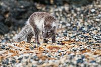 Deze poolvos is op een kiezelstrand op Spitsbergen op zoek naar voedsel.