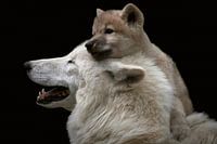 De moeder die van de poolwolf met leuke pup (Canis lupus arctos), close-up en zwarte achtergrond knuffelt.