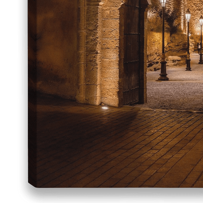 Een van de toegangspoorten tot de Kasbah van de Udayas na zonsondergang. Verlicht door lantaarns kun je verder de Kasbah in lopen.