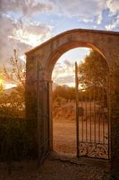 De toegangspoort van de kerk van Santa Maria in Orosei/Sardinië, verlicht door avondlicht.
