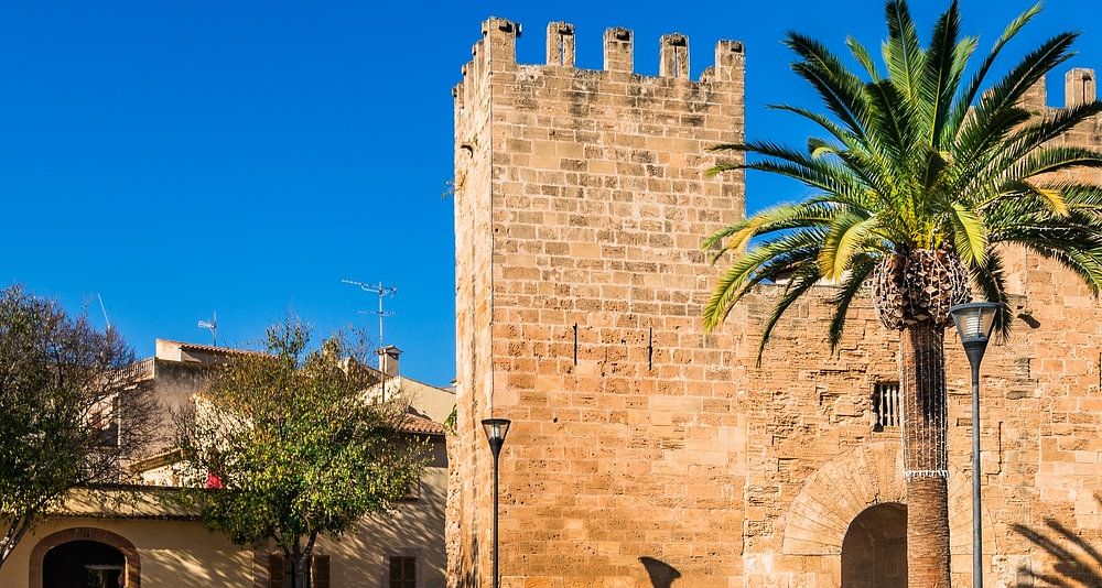 Poort van de Vestingmuur in Alcudia oude stad, Mallorca Spanje, Mallorca, Balearen, Balearen, Middellandse Zee, Spanje
