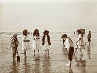 Jongens en meisjes zijn, geheel aangekleed, aan het pootje baden in zee, een jongen heeft een schep een ander laat een bootje varen.