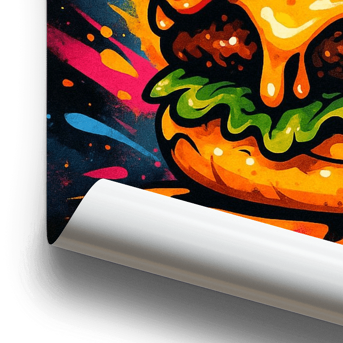 Deze energieke digitale poster is een krachtig eerbetoon aan een van de meest herkenbare symbolen van de moderne eetcultuur: de hamburger. Gepresenteerd in een expressieve pop-artstijl, explodeert het motief letterlijk van kleur, dynamiek en levensvreugde. Sappige paté, gesmolten kaas, knapperige bacon en verse salade zijn hier niet…