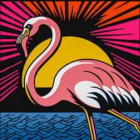 Dit werk van een flamingo bij de ondergaande zon is gemaakt in de stijl van Roy Lichtenstein en past perfect in een modern en retro interieur!
