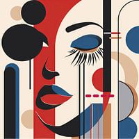 Dit schilderij is een boeiend voorbeeld van Pop Art dat fascineert met zijn opvallende geometrische vormen en levendige kleuren. De gestileerde weergave van een vrouwengezicht, geaccentueerd door felrode lippen en gesloten ogen, creëert een balans tussen abstractie en elegantie. Het gebruik van cirkels, rechthoeken en vloeiende lijnen geeft het werk een dynamische, moderne esthetiek die zowel retro- als hedendaagse kunstliefhebbers aanspreekt.