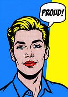 Pop-art portret van een blond persoon met geel haar, blauwe ogen, rode lippen tegen een blauwe en gele achtergrond, met "PROUD!" tekstballon.