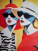 Dit schilderij toont twee gestileerde vrouwen met opvallende zonnehoeden en donkere zonnebrillen, die een elegante en mysterieuze uitstraling uitstralen. Het kleurenpalet van rood, blauw, zwart en wit geeft de compositie een sterk grafisch effect, terwijl de strakke lijnen en schaduwvlakken de popart-esthetiek benadrukken. Het samenspel van gestreepte patronen, rode accenten en een zonnige gele achtergrond straalt een zomerse, modieuze flair uit met een vleugje retro glamour.