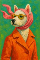Een elegant hondachtig stijlicoon gehuld in een feloranje jas, met een roze hoofddoek en gele zonnebril — alsof ze zo uit een vintage filmset komt gewandeld. Deze kunstzinnige schilderstijl combineert humor met klasse en maakt van elk interieur een gespreksonderwerp.