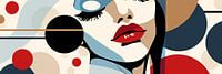 Dit schilderij is een boeiend voorbeeld van Pop Art dat fascineert met zijn opvallende geometrische vormen en levendige kleuren. De gestileerde weergave van een vrouwengezicht, geaccentueerd door felrode lippen en gesloten ogen, creëert een balans tussen abstractie en elegantie. Het gebruik van cirkels, rechthoeken en vloeiende lijnen geeft het werk een dynamische, moderne esthetiek die zowel retro- als hedendaagse kunstliefhebbers aanspreekt.