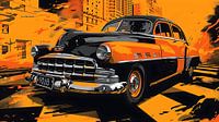 De auto in de stijl van een feloranje en zwarte op-art poster is een visueel spektakel op wielen. De carrosserie van de auto straalt in een opvallende feloranje kleur diep en helder als een fluorescerende gloed. Dit contrasteert scherp met het diepe, duistere zwart dat strategisch is geplaatst om geometrische patronen te vormen die doen denken aan op-art.
