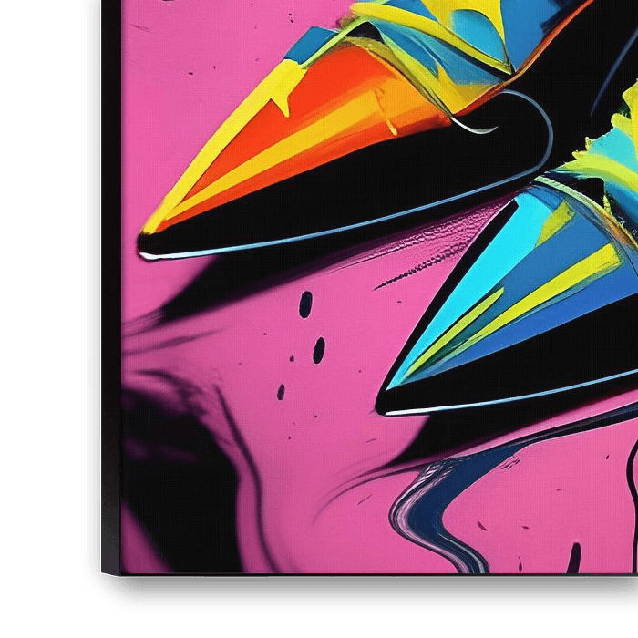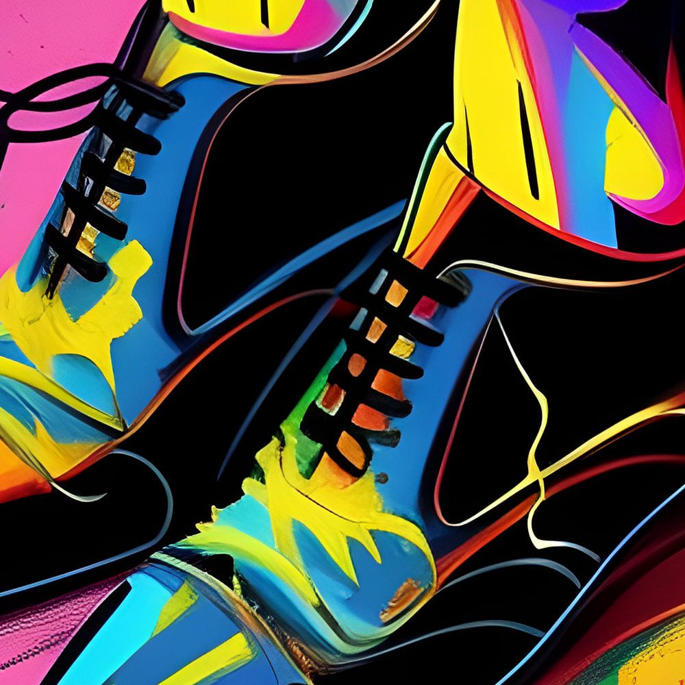De kleurrijke en gedurfde esthetiek van popart komt tot leven in dit kunstwerk. De schoenen zijn ware kunstwerken op zichzelf, met heldere, contrasterende kleuren die knallen tegen de achtergrond. De vormen en lijnen van de schoenen worden versterkt door de elementen die kenmerkend zijn voor popart, wat zorgt voor een visueel prikkelend schouwspel.