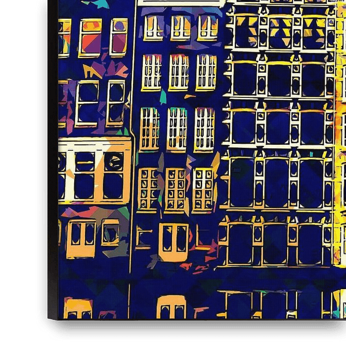 Een levendig en opvallend pop-art kunstwerk van de iconische Amsterdamse grachtenpandjes. Met heldere kleuren en grafische vormen brengt dit werk energie en karakter in moderne interieurs. Perfect voor liefhebbers van stedelijke kunst met een twist.