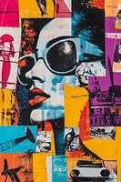 Dit unieke kunstwerk combineert pop-art elementen en felle kleuren om een gedurfde en levendige collage te creëren. Centraal staat het portret van een vrouw met zonnebril, omringd door diverse iconische en stedelijke afbeeldingen, zoals een auto, abstracte patronen en silhouetten. De kleuren knallen van het doek, met een dynamisch palet…