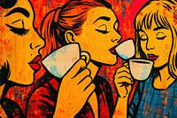 Drie vrouwen nippen aan dampende koffie, omlijst door dikke zwarte contouren en heldere vlakverdelingen. Witte kopjes steken scherp af tegen een warme mix van rood, oranje en geel, terwijl een koel blauw ruitpatroon de compositie balanceert. Expressieve lippen, gesloten ogen en strakke kapsels geven een retro pop art uitstraling. Het…