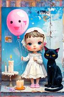 Een kleine pop viert haar verjaardag met haar lieve kat, een roze ballon met een vrolijk gezichtje er op en taart met kaarsjes. Zij heeft een kanten jurkje aan en mooie roze schoentjes, liever dan dit wordt het niet. Het beeld is met behulp van ai gegenereerd.