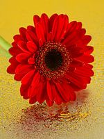 Deze bloem ligt op een spiegelend oppervlak en er valt een warm goudkleurig licht op. Dit zorgt voor een warme uitstaling naast de al warme kleuren van de rode Gerbera en de gele achtergrond.