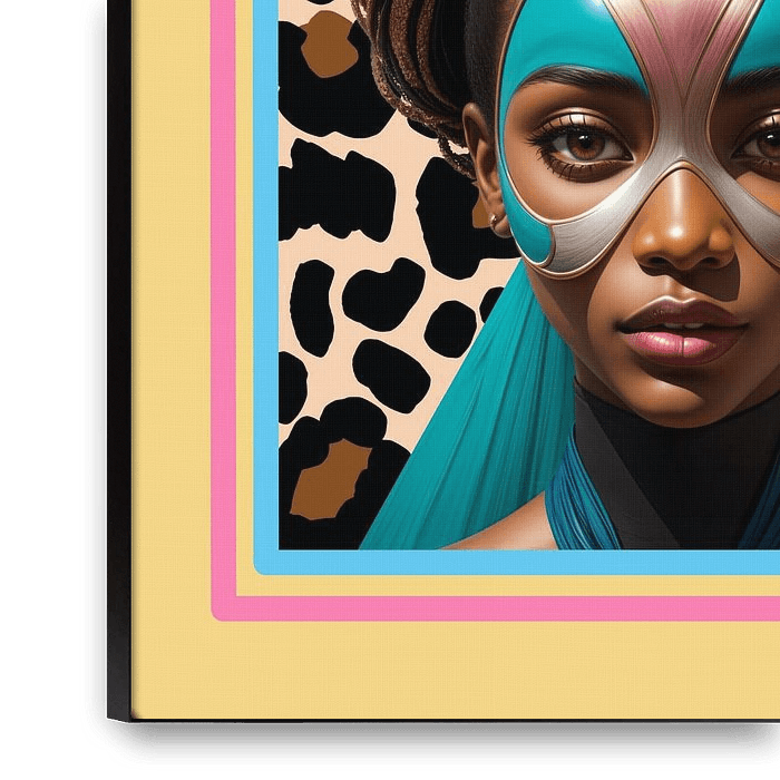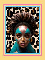 Te zien is een Afrikaanse vrouw met opgestoken haar en een kleurrijk gezichtsmasker. Op de achtergrond vlekken van een luipaard en de kleuren die passen bij de nieuwe trend Pop of colour.
