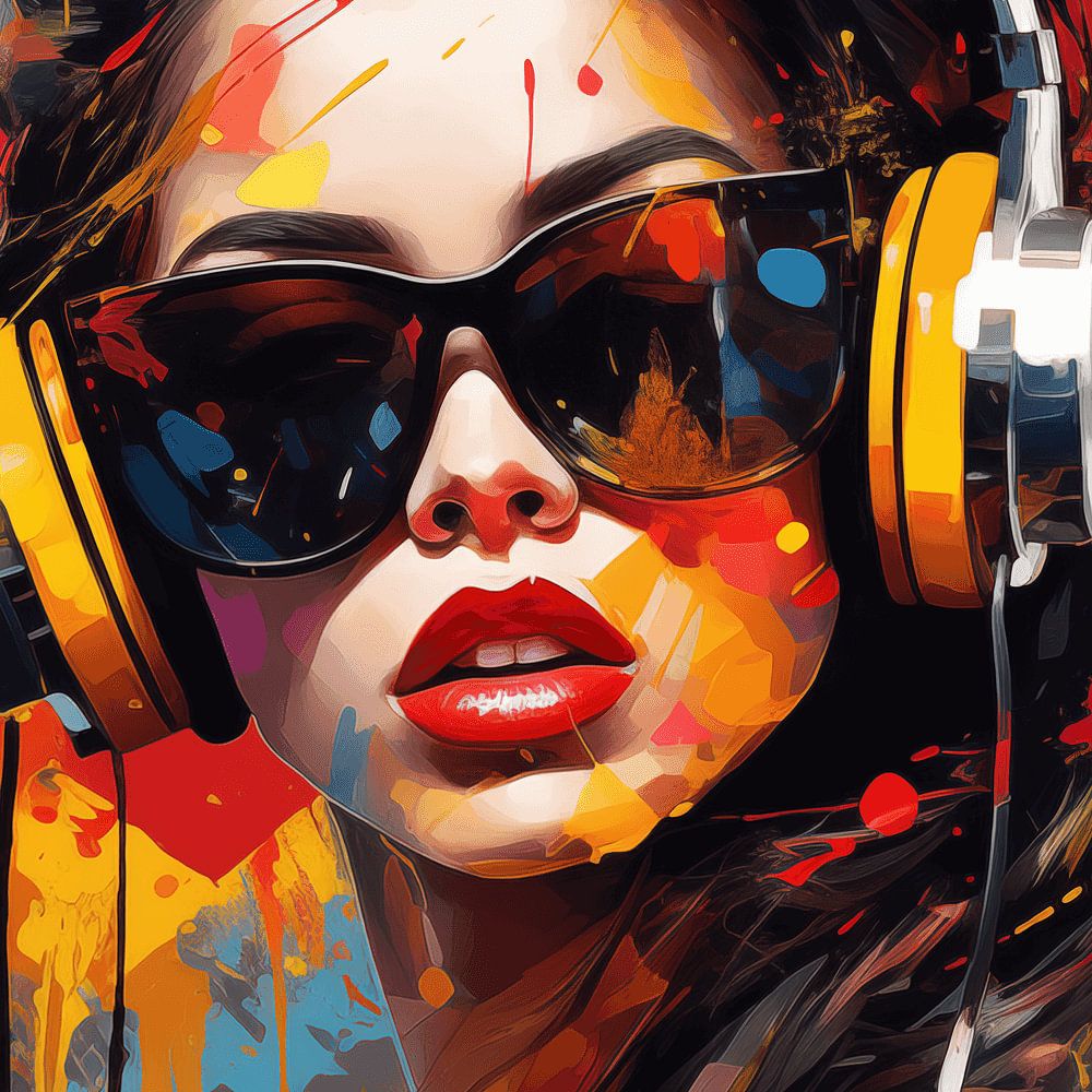 Portret in PopArt style van een vrouw die naar muziek luisterd. Haar zonnebril en koptelefoon geven een stoere uitstraling. De grijze achtergrond laat de andere kleuren extra poppen.