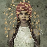 Dit digitale kunstwerk toont een Vintage Beauty met een rode badmuts en lange, klassieke vlechten.
