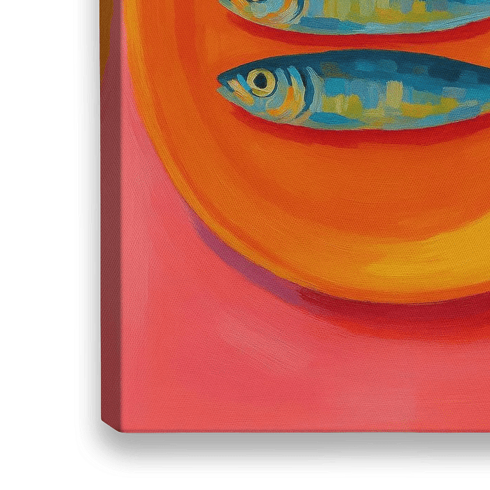 Vier levendige vissen liggen in perfecte harmonie op een feloranje bord, omlijst door een knallend roze achtergrond. Deze speelse compositie barst van kleur, contrast en karakter – een echte blikvanger voor je muur!