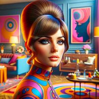 Het visuele festijn toont een bijenkorfkapsel, opvallende eyeliner en een vintage mod-jurk die de iconische stijl van het decennium belichaamt. Elk element is weergegeven met…