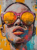 Een coole popart poster van een hippe, kleurrijke vrouw spat van het doek met levendige tinten en dynamische vormen. Haar haar is in heldere kleuren zoals roze, blauw en paars weergegeven, terwijl haar make-up gedurfde lijnen en contrasterende kleuren bevat. De achtergrond is een explosie van abstracte patronen en felle kleuren die de energie en levendigheid van de vrouw benadrukken. Ze draagt een stijlvolle zonnebril en opvallende accessoires die haar trendy uitstraling versterken. De combinatie van scherpe contouren en speelse kleurvlakken maakt de poster tot een eyecatcher, die de essentie van moderne, stedelijke coolness vastlegt en een gevoel van creativiteit en vrijheid uitstraalt.